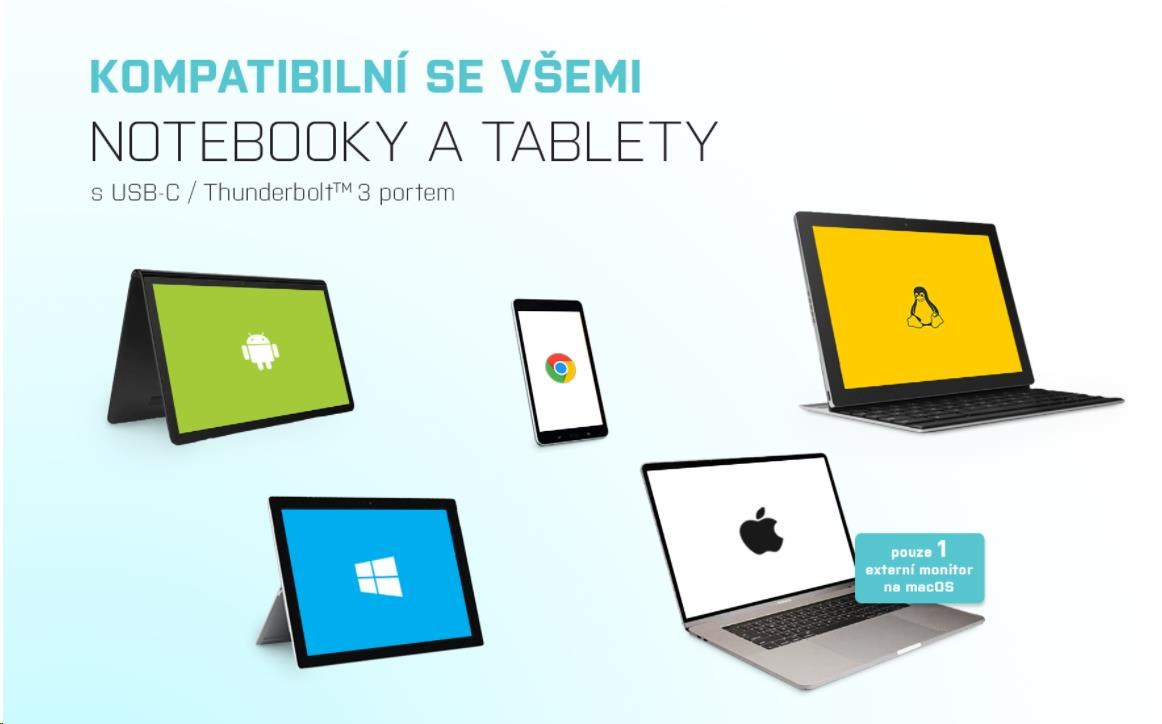 Tato dokovací stanice je navržená tak, že se dá použít s libovolným notebookem, tabletem nebo chytrým telefonem, bez ohledu na typ, značku nebo operační systém. Stačí, aby otebook/tablet/tetefon měl volný Thunderbolt 3 či USB-C port, který umí přenášet video signál.