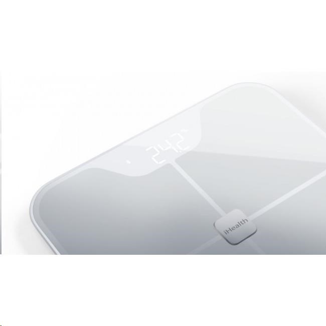 Lehká designová osobní váha s analýzou složení těla Měří 11 údajů týkající se hmotnosti a složení těla (hmotnost, BMI, podíl netučné, kostní, svalové a vodní hmoty, tělesný a útrobní tuk, metabolický věk, bazální metabolismus a množství bílkovin v těle) Separátně měří srdeční tepovou frekvenci Světelný LED displej Možnost nastavení až 8 uživatelů Přehledné sledování dat a historie v doprovodné aplikaci iHealth MyVitals Paměť zařízení až 500 měření pro každého uživatele (po synchronizaci s aplikací neomezeně) Pohodlné sdílení dat s lékařem nebo rodinou Přístup k zabezpečenému cloudovém účtu odkudkoliv (PC, tablet, smartphone) Neinvazivní metoda měření ze spodní části těla, zcela bezpečná i pro těhotné ženy Certifikováno CE jako zdravotnické zařízení Povrch z tvrzeného skla Konektivita Bluetooth 4.0 Technologie analýzy tělesného složení