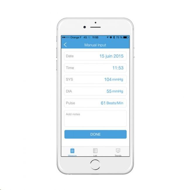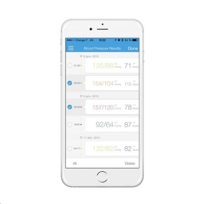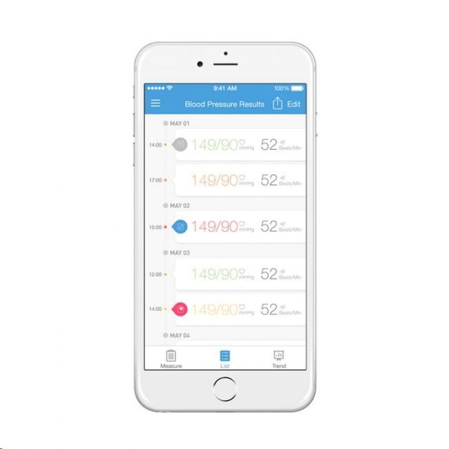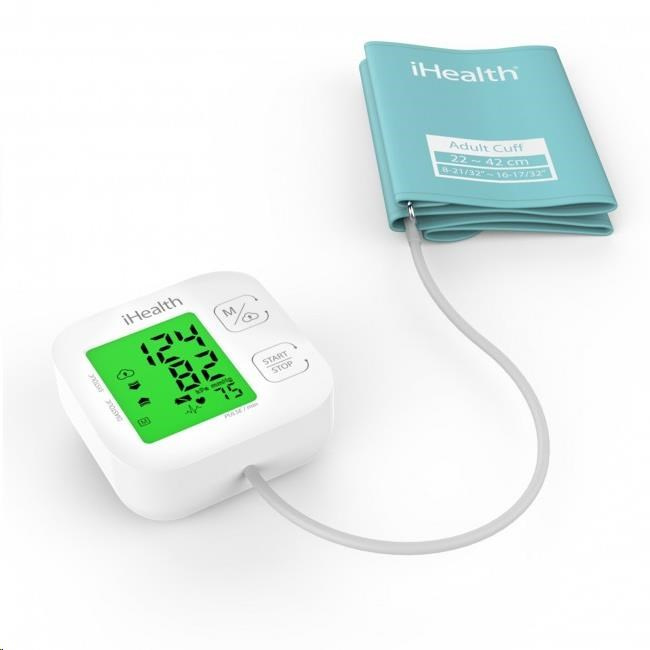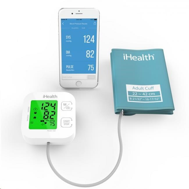 Vlastnosti a specifikace: Certifikace CE jako zdravotnické zařízení Měří systolický a diastolický krevní tlak a srdeční pulz Oscilometrická metoda měření Automatické nafouknutí manžety a provedení měření stiskem jediného tlačítka Místo měření: standardní – paže nad loktem Offline paměť pro 99 měření Možnost synchronizace s aplikací iHealth MyVitals (zdarma pro zařízení se systémem iOS a Android) Bezdrátový přenos naměřených hodnot do mobilního zařízení přes Bluetooth 4.0 Možnost ukládání, editace a prohlížení hodnot na cloudovém účtu, přístup z počítače Tlakový rozsah manžety: 0 až 300 mmHg Přesnost měření tlaku: ±3 mmHg Rozsah měřeného tlaku (systolický/diastolický): 60 až 260 / 40 až 199 mmHg Rozsah měřeného srdečního tepu: 40 až 180 úderů za minutu s přesností ±5 % Délka manžety: 22 až 42 cm Napájení: 4x AAA baterie Životnost baterií: cca 250 měření Automatické vypnutí po 1 minutě nečinnosti Rozměry přístroje (bez manžety): 98 x 98 x 46 cm Hmotnost přístroje (včetně manžety a baterií): 348 g