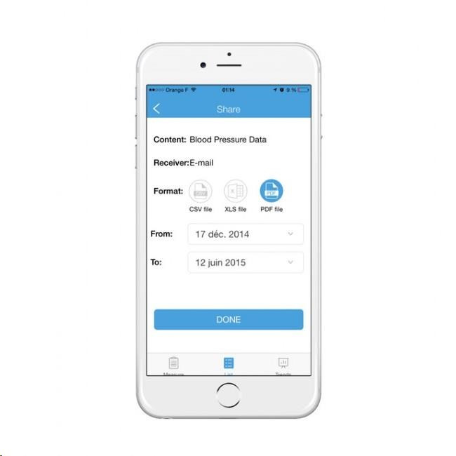 Aplikace iHealth MyVitals umožňuje naměřené hodnoty odeslat e-mailem v rámci rodiny, přátelům nebo osobnímu lékaři.