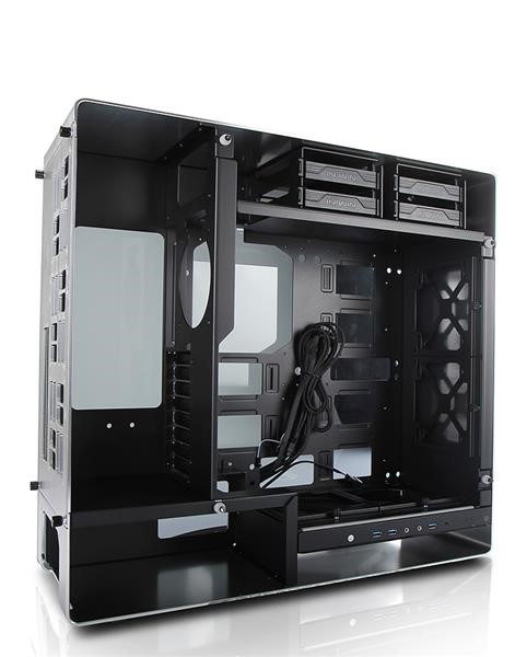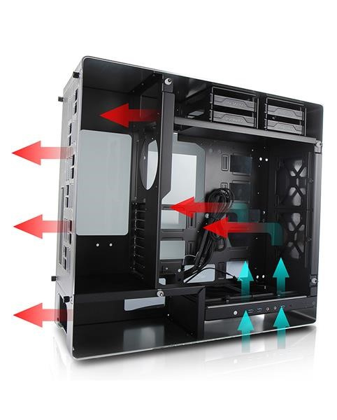 Oddělené pozice HDD a PSU zajišťují ideální proudění vzduchu skrz skříň ven zadními větracími otvory, aniž by se odvod teplého vzduchu brzdil o základní desky nebo grafické karty.