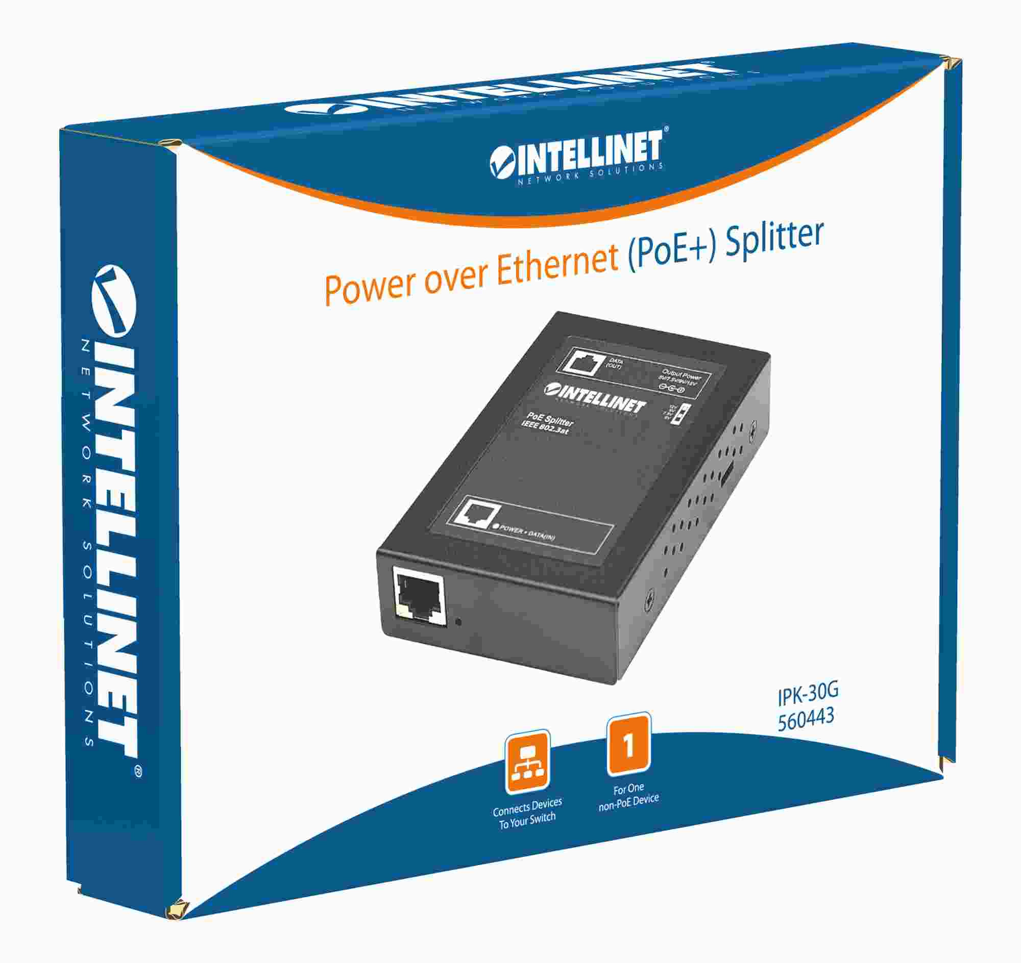 Popis Intellinet 1-port PoE+ Power over Ethernet Splitter, 802.3at/af
