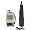 Net Toner and Probe Kit Tone Generator [515566] •Tests datacom, telecom, security, video, and audio networks •Two position switch for single or multi-tone signal •LEDs for line polarity, continuity and voltage •Enhanced talk battery mode provides power for voice communications over inactive pairs •Testing leads and modular cables for individual wire tests or modular jack tests •Replaceable plastic tip to prevent accidental shorts •Trace or identify wire or cables in a bundle or group •Alligator clips, RJ45 jack, RJ12 plug, optional F-connector Color •Beige Specifications •Net Toner •Toner Frequency: High alternating 500-781 Hz ; Low alternating 446-657 Hz •Talk Battery: 9V into a 600 ohms circuit •Voltage protection: 50 VDC or 24 VAC •Battery: 9V DC standard or alkaline •CE Approved: EN 55022 Class B for ITE and EN 55024 •Size: 125 (L) x 68 (W) x 26 (H) mm (4.9 x 2.7 x 1.2 in.) •Weight: 120g (.37 lb) Net Probe •Gain: 30 db •Tip resistance: 30 ohms (Plastic tip) •Battery: 9V DC standard or alkaline •CE Approved: EN 55022 Class B for ITE and EN 55024 •Size: 210 (L) x 40 (W) x 28 (H) mm (8.1 x 1.6 x 1 in.) •Weight: 140g (.30 lb) Environmental: •Operating temperature: 0 – 40°C (32 – 104°F) Package Contents •Net Probe •Net Toner w/ Alligator clips and RJ-12 connector •Female F-connector to RJ-45 adapter •Carrying pouch •User Manual.