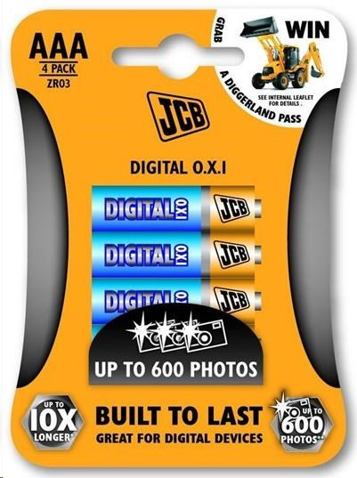 JCB OXI DIGITAL baterie jsou nejsilnějšími JCB bateriemi. JCB OXI jsou jedinými bateriemi, které vydrží až 10x déle v porovnání s obyčejnými alkalickými bateriemi. Zajistí spolehlivý výkon pro přístroje typu: digitální fotoaparáty, CD přehrávače, hi-tech hračky Kvalita testována prestižní globální společností BUREAU VERITAS. V konkurenci vybraných známých značek se JCB baterie vždy umístili na předních místech. Typ LR03 Blistr 4 ks.