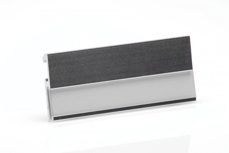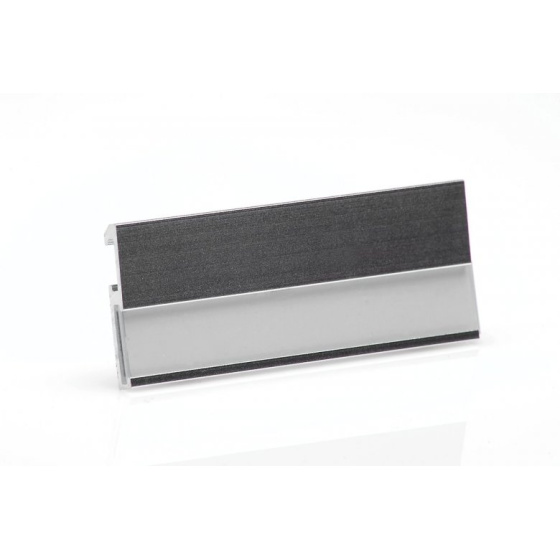 Luxusní kovová jmenovka o rozměru 70×25 mm. Vnitřní rozměr 70×10 mm. Provedení z hliníku s matovou povrchovou úpravou. Část jmenovky určená k popisu je chráněna čirým tuhým plastem, potaženým snímatelnou fólií. Možnost uchycení na oděv pomocí špendlíku nebo speciálních plastových úchytek..