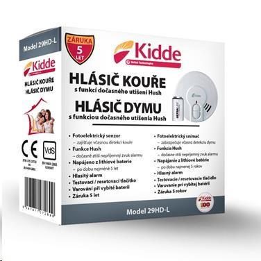Hlásič požáru je vybaven testovacím tlačítkem TEST pro kontrolu správného fungování zařízení a HUSH pro přechodné umlčení požárního hlásiče pro případ planého alarmu. Stisknutí tlačítka způsobí okamžitou deaktivaci alarmu, na dobu asi 10minut, snížení citlivosti obvodů a vypnutí akustické signalizace hlásiče. Tlačítko HUSH používejte pouze tehdy, pakliže znáte příčinu aktivace hlásiče (např. při vaření nebo smažení). Po cca 10 minutách od deaktivace hlásiče se tento zcela automaticky resetuje do původního nastavení pro monitorování nebezpečí požáru. Pokud v místnosti zůstane vysoká koncentrace kouře, můžete stisknout tlačítko HUSH opakovaně a to až do okamžiku kdy je místnost řádně odvětrána. Tento model je vybaven nejmodernějším fotoelektrickým senzorem Kidde.