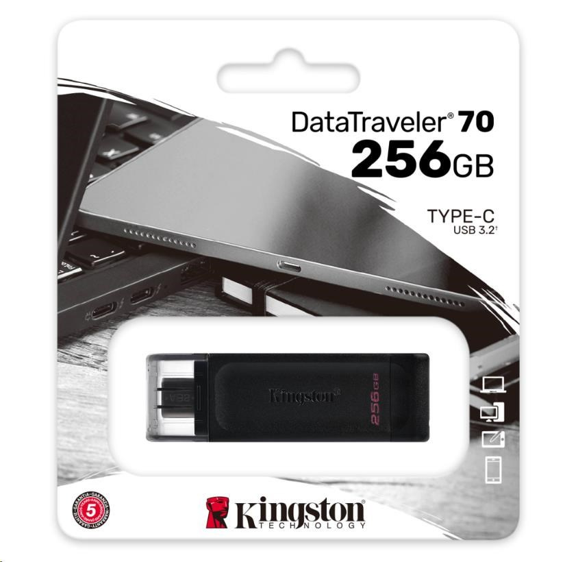 Akční nabídky na váš e-mailKingston’s DataTraveler 70® is a USB 3.2 Gen 1 compliant portable, lightweight USB-C1 flash drive. It’s designed to be used with compatible USB-C devices such as notebooks, laptops, tablets and phones. With capacities of up to 256GB2, the DataTraveler 70 is more than capable of expanding your storage for everyday use. It comes backed with a 5-year warranty and free tech support.