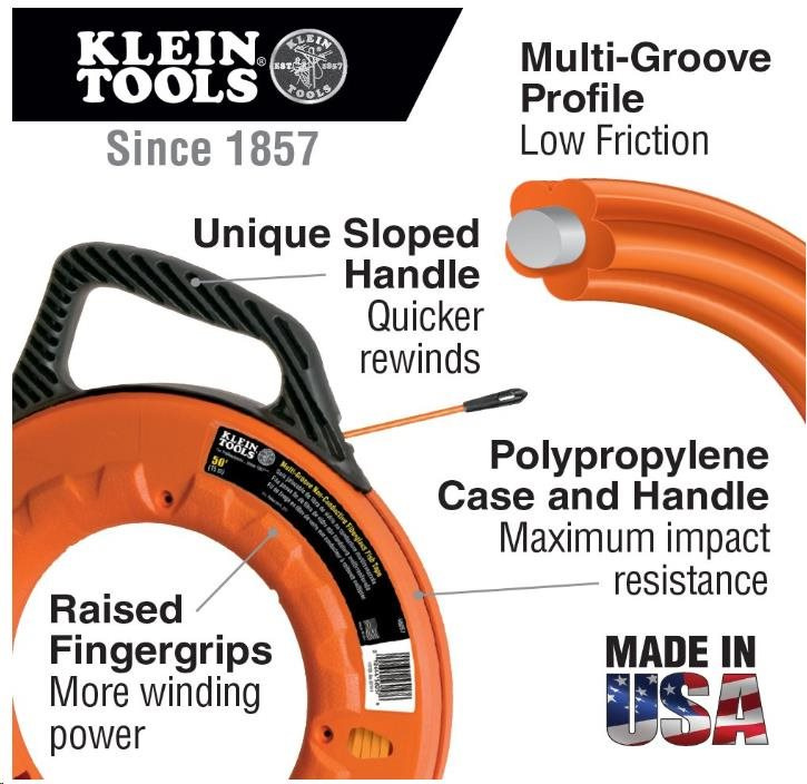 Protahovací pero Klein Tools zakončené ocelovou spirálou, sklolaminátové jádro, délka 30m, průměr 4.8mm