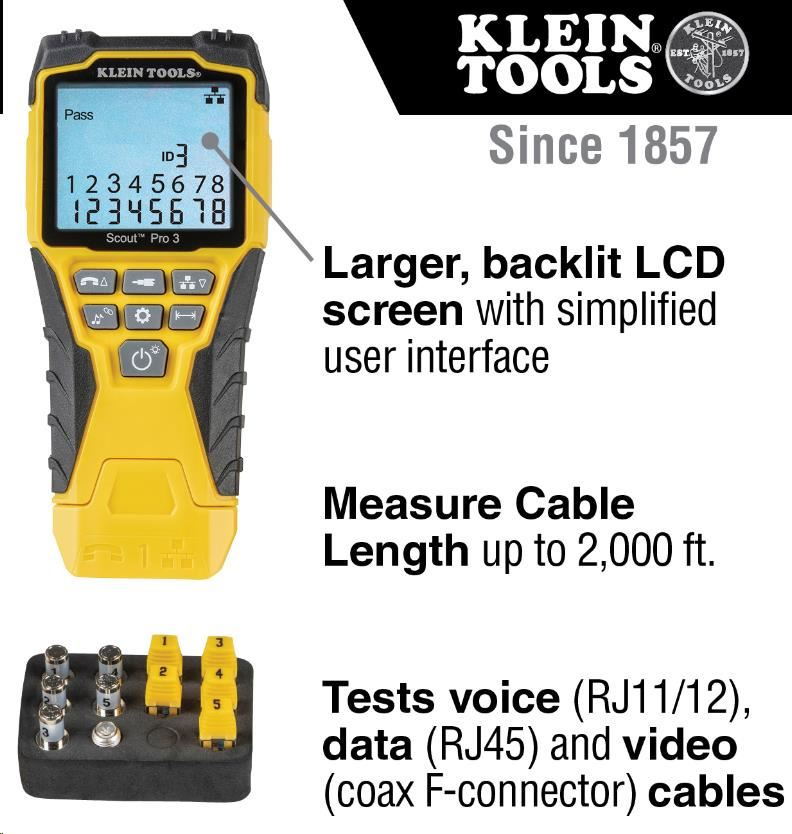 Akční nabídky na váš e-mailStránky produktu: https://www.kleintools.com/catalog/cable-length-measurement/cable-tester-kit-scout-pro-3-tester-remotes-adapter-battery User Manual