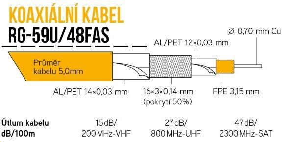 Akční nabídky na váš e-mailBalení: na cívce 305 m, Plášť kabelu: PVC bílé barvy, Průměr kabelu: 5 mm Použití a specifikace: • kratší přívody kamer PAL nebo HD-CVI/TVI do 150 m • kratší bytové přívody vysílání kabelové CCTV do 30 m • kratší bytové přívody vysílání pozemní DVB-T/T2 do 30 m • kratší bytové přívody satelitní DVB-S/S2 do 30 m • impedance kabelu 75 Ohm • celoměděné jádro o průměru 0,70 mm • účinnost stínění třída B (UHF) • trojité stínění zaručuje velmi dobrou odolnost proti rušení při souběhu kabelů • malý průměr kabelu umožňuje uložení zvýšeného počtu kabelů v chráničce