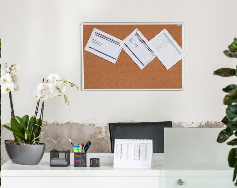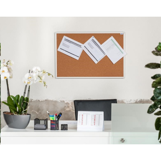 Akční nabídky na váš e-mailKorková nástěnka AVELI má vysoce odolný povrch proti poškození při práci s napínáčky a špendlíky. Má lehkou konstrukci a elegantní rám z kvalitního eloxovaného hliníku. Nástěnka má světle šedé plastové rohy, které zakryjí upevnění na zeď.