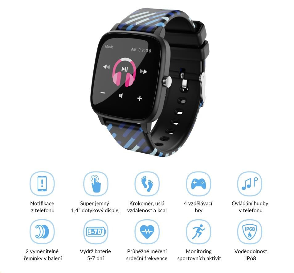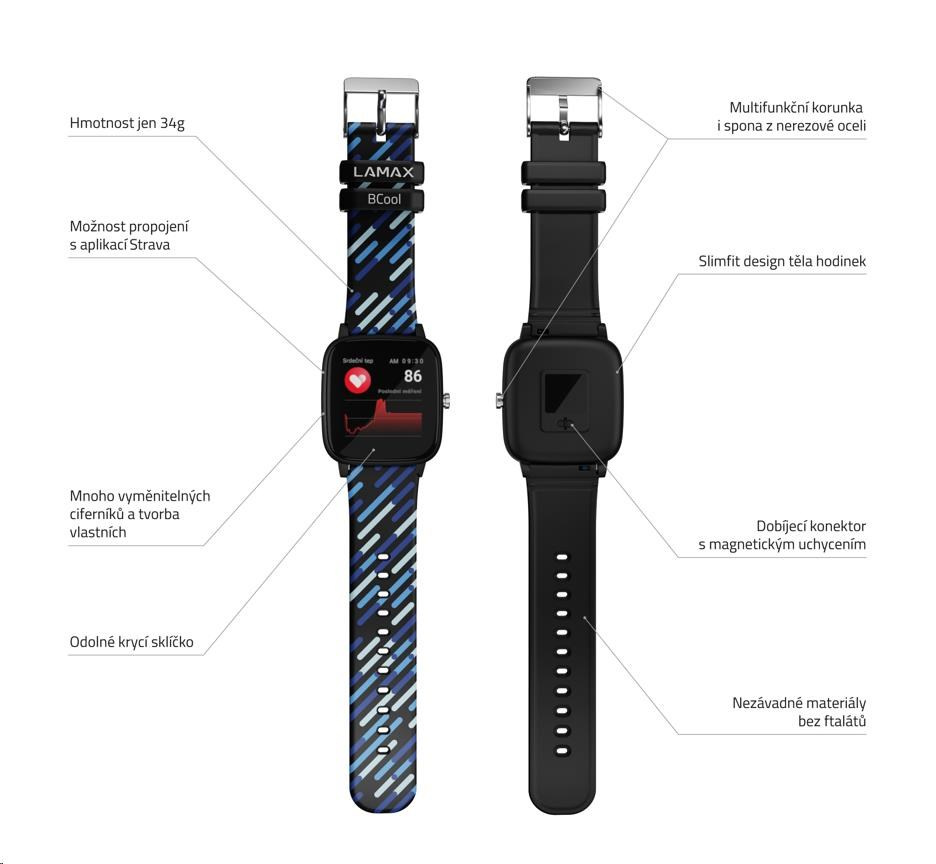 Sport a zábava na zápěstíChytré hodinky LAMAX BCool se stanou nejlepším parťákem vašeho potomka. Parádním designem ohromí všechny kámoše, postarají se o ovládání hudby a zajistí, že dítě bude vědět o všem důležitém i ve chvíli, kdy je lepší nechat telefon v tašce. Motivujte své ratolesti k pohybu a odměňte je za splněné výzvy – hodinky jim spočítají celodenní aktivitu a změří tep nebo spánek. S dvěma barevnými řemínky v balení a týdenní výdrží na baterku nešlápnete vedle.