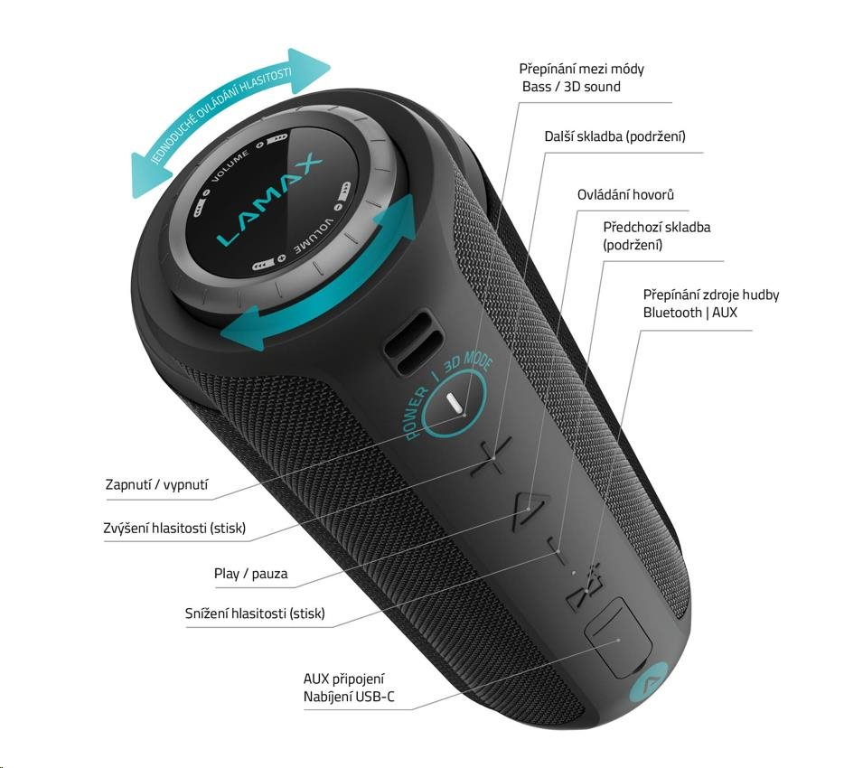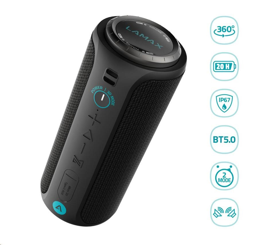 Na hlasitosti záležíVíc hudby, víc párty, víc pořádnýho soundu! LAMAX Sounder2 Max je nabušenější parťák Sounder2. Do většího těla se vešel mohutný 50W výkon, který překřičí konkurenci i sousedy. Díky masivní baterce ti budou beaty dunět v uších nonstop až 20 hodin. Vezmi kámoše a ukaž jim svůj hudební styl – doma nebo uprostřed džungle. S vysokou voděodolností a easy přenášením je to na tobě.