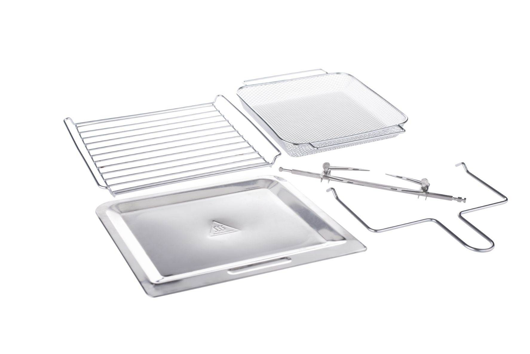 1 klasická mřížka na plech nebo různé formy, 1 rotační koš na hranolky, 1 hlubší mřížka na pečení kuřecích křídel, brambor, 1 plochá mřížka na sušení ovoce či hub, 1 odkapávací plech, který zachycuje tuk a olej, jehla na rožnění celého kuřete, úchyt.