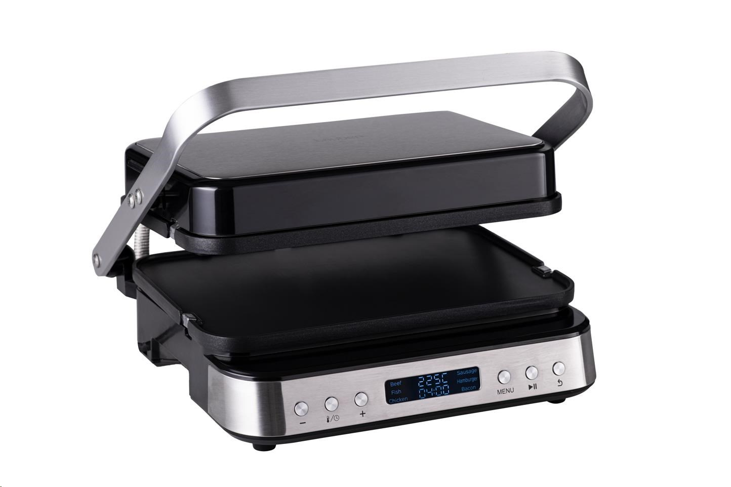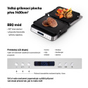 Kontaktní gril na zapékání, který po uvedení do vodorovné polohy přetvoříte na plnohodnotný stolní gril o ploše 1400 cm2.