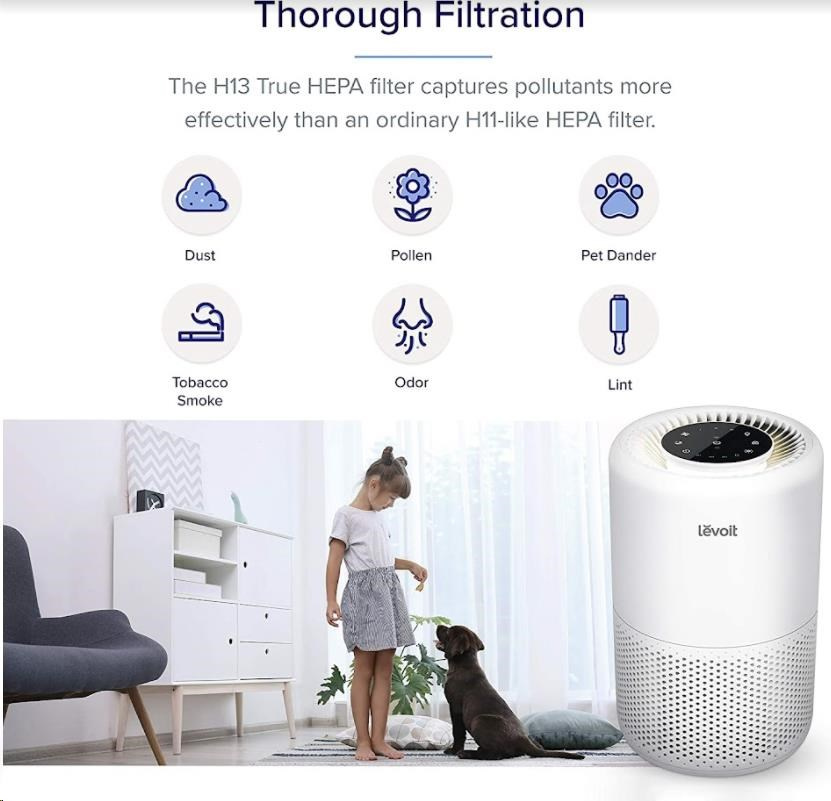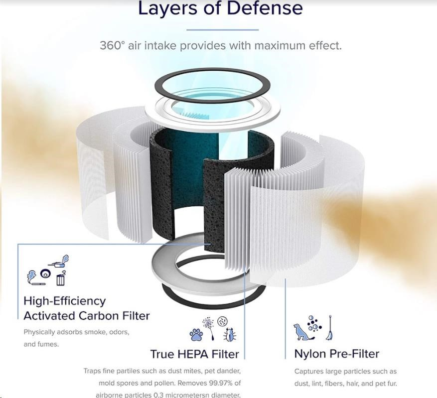 Druhou vrstvou je HEPA filtr H13. To odlišuje Levoit od konkurence, protože filtr HEPA H13 je mnohem kvalitnější a spolehlivější než běžně používané HEPA H11. Tu se odfiltrují jemné prachové částice, plíseň, bakterie, pyl, kouřové částice, roztoče a srst.
