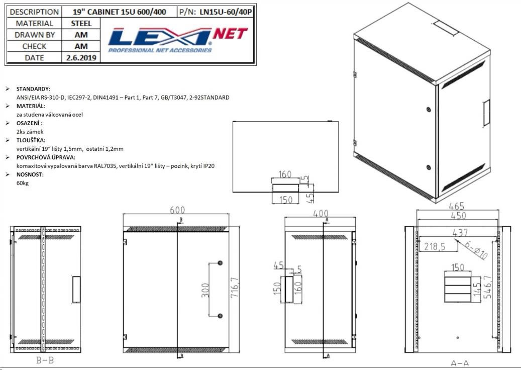 | Povrchová úprava: | komaxitová vypalovaná barva RAL7035 - šedá vertikální 19" lišty - pozink |