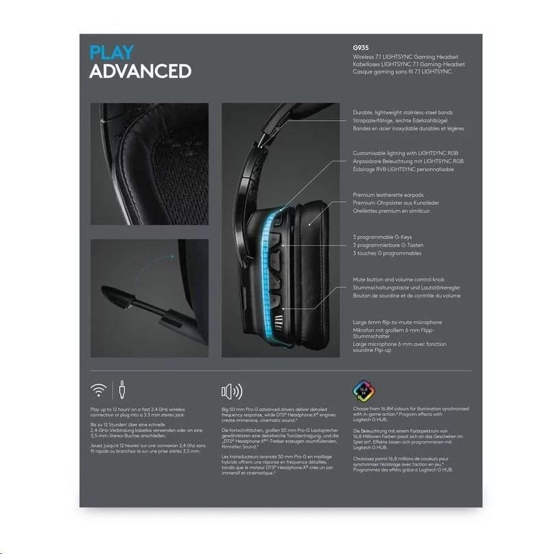 Popis Logitech herní sluchátka G935, Wireless 7.1, LIGHTSYNC Gaming Headset - EMEA