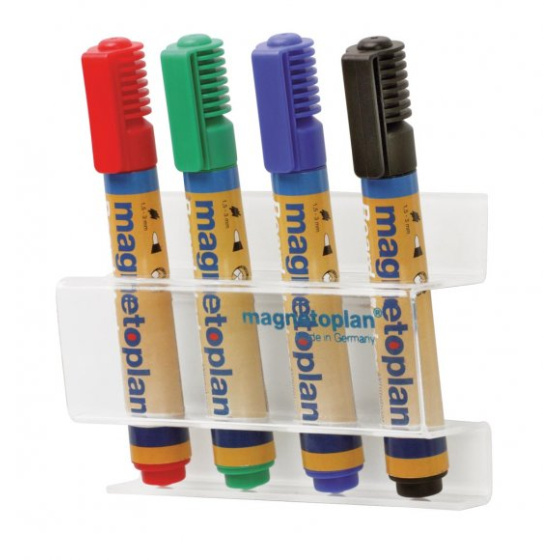 Praktický, magnetický držák na 4 ks popisovačů. Vyroben z průsvitného acrylu. 4 otvory o průměru 20 mm. Dodáván bez popisovačů..