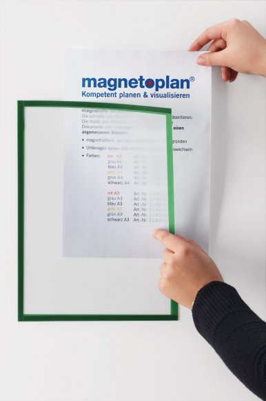 Magnetický rámeček Magnetofix, zvýrazní dokument. Pro formát velikosti A4 tj. 297×210 mm. Matný antireflexní povrch průsvitné fólie. Šířka barevného rámečku 9 mm. V místě barevného rámečku je fólie podlepená magnetickou páskou. Rámeček tak lze umístit na magnetický povrch tabule nebo vitriny. Pod rámečkem vložený dokument lze velmi snadno vyměnit..