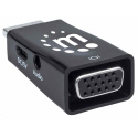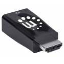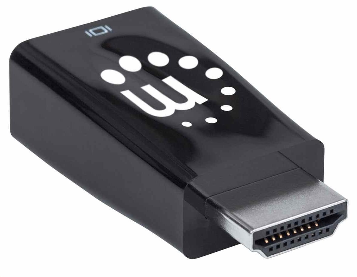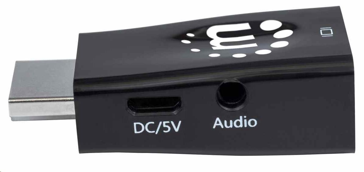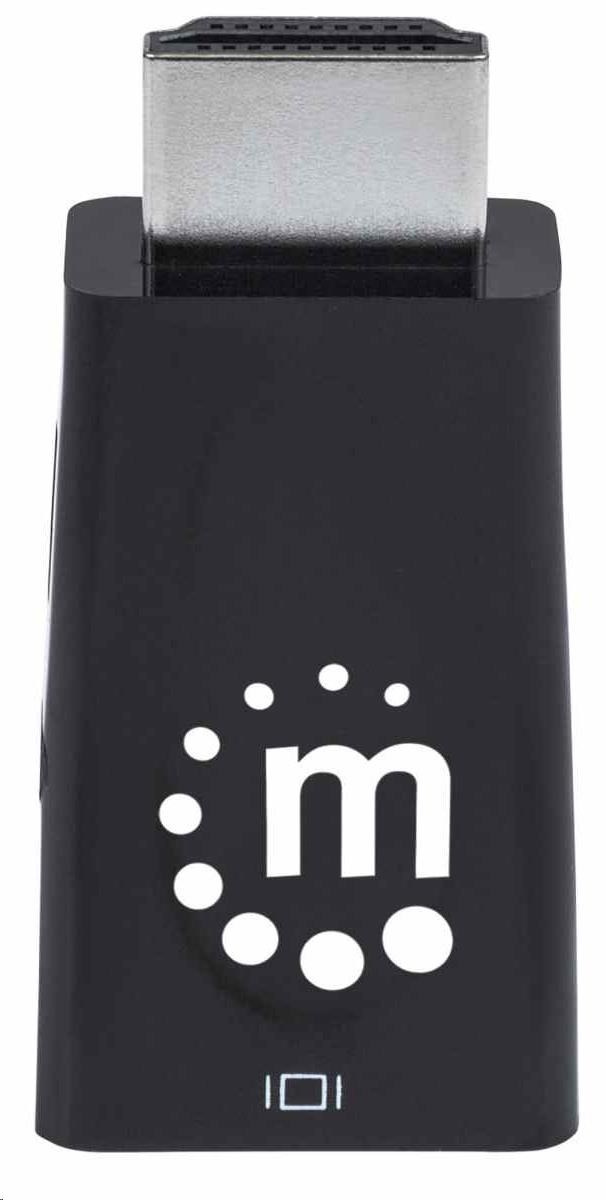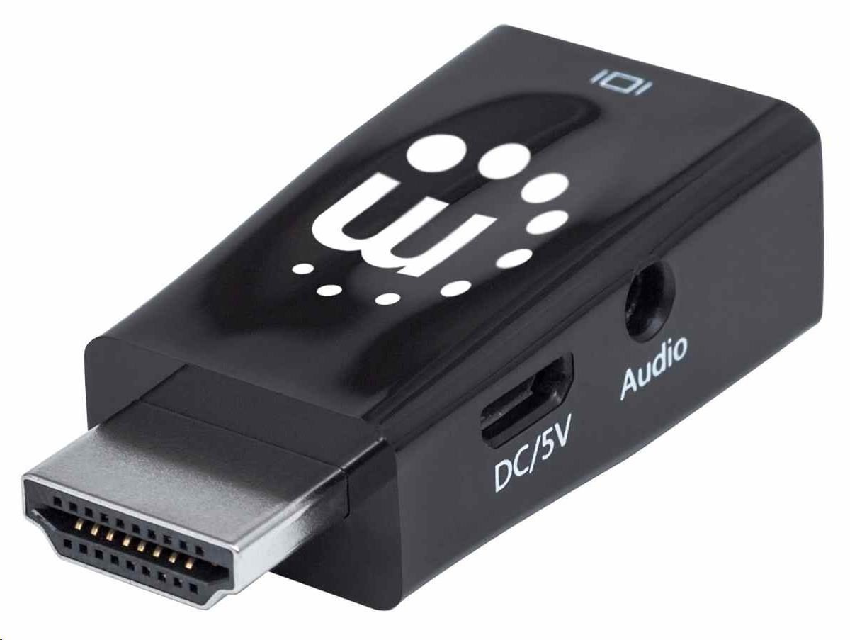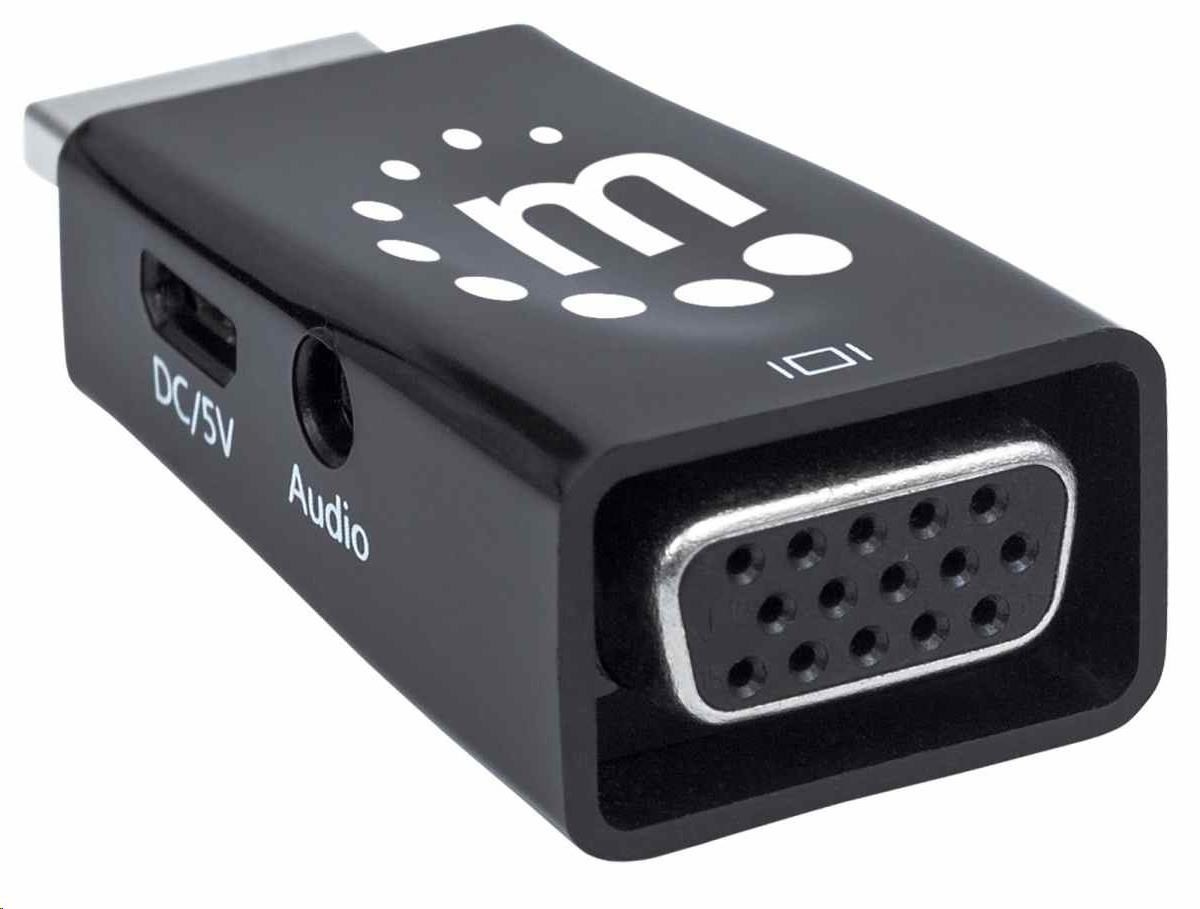 Akční nabídky na váš e-mailThe Manhattan HDMI to VGA Micro Converter establishes a fast, simple and convenient link between a newer HDMI-equipped desktop, notebook computer or other media source and an existing VGA monitor, projector or other display device. The Manhattan HDMI to VGA Micro Converter is easy and quick to install and requires no complicated configuration or setup. This converter helps extend the service life of legacy VGA display equipment so you can get the most out of your investment and fully realize its value. The Manhattan HDMI to VGA Micro Converter offers a low-power, cost-effective and reliable solution so users can transition to HDMI bandwidths, resolutions, Deep Color and more without the expense of upgrading to newer and costly monitors and projectors. Its integrated, all-in-one design helps achieve a compact, integrated solution that eliminates unnecessary cables, tangles and clutter to keep installations and workspaces neat and orderly. Its 3.5 mm stereo port allows the converter to transmit audio to an external audio device, and its Micro-USB port allows for additional power if required.