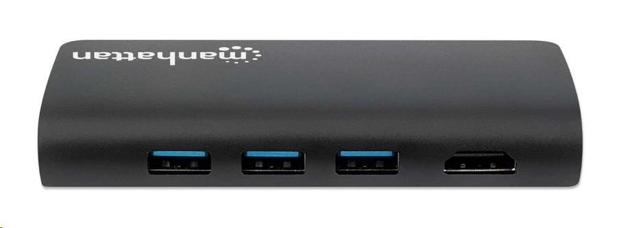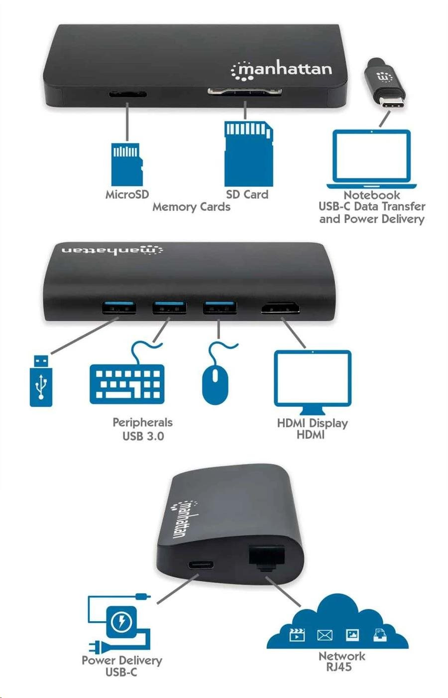 Akční nabídky na váš e-mailUSB 3.2 Gen 1 Type-C Male to HDMI (4K@30Hz) Female, Three SuperSpeed USB-A Ports, USB-C Power Delivery (PD 3.0) Port, Gigabit RJ45 Port and SD/MicroSD Card Reader; Aluminum, Black