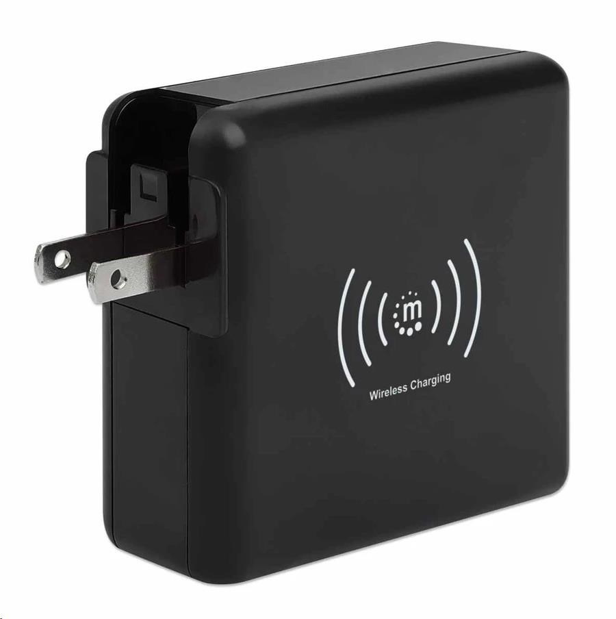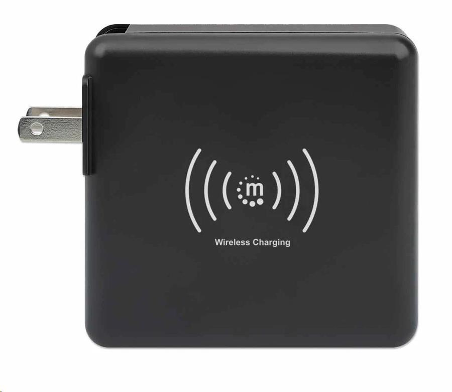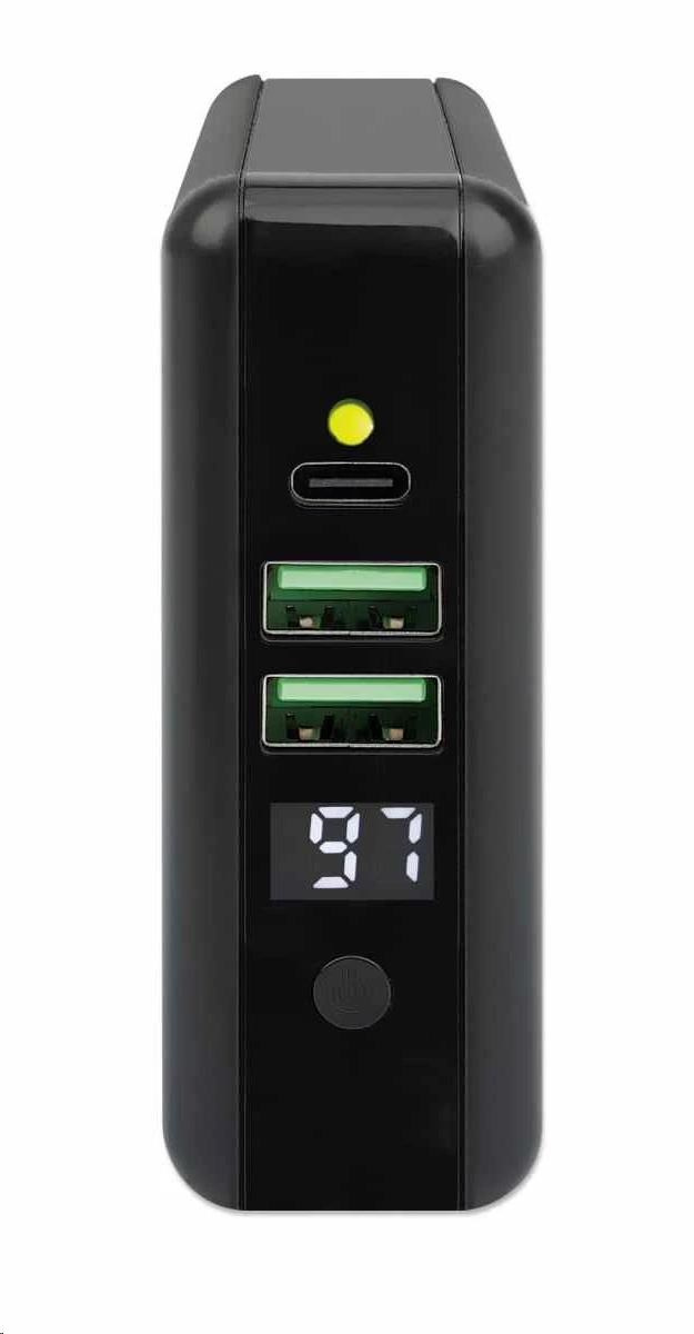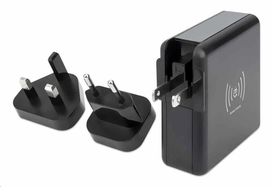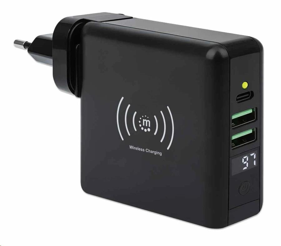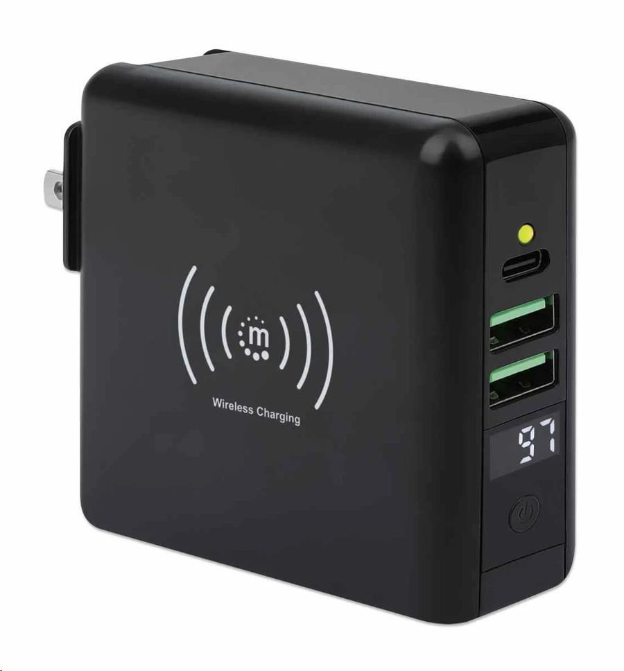 Akční nabídky na váš e-mailThe Manhattan 4-in-1 Travel Wall Charger and Powerbank 8,000 mAh provides you with incredibly useful functions on one device. Use it as a USB wall charger to charge smartphones, tablets, eReaders, headphones and more from two USB-A and one USB-C port with per-port power up to 5 V / 2.4 A. You can also skip the wires altogether and charge compatible mobile devices on the 5 W wireless charging pad. For even more convenience, this all-rounder lets you charge on the go without plugging into a socket since it's also an 8,000 mAh powerbank. Its convenient digital number display lets you check the remaining battery at any time. Recharge the powerbank directly via AC on a power outlet or through its USB-C port. Finally, if you're an international traveler, you'll love its foldable US and swappable UK and EU plugs that let you charge devices in the many regions that offer these outlet types.