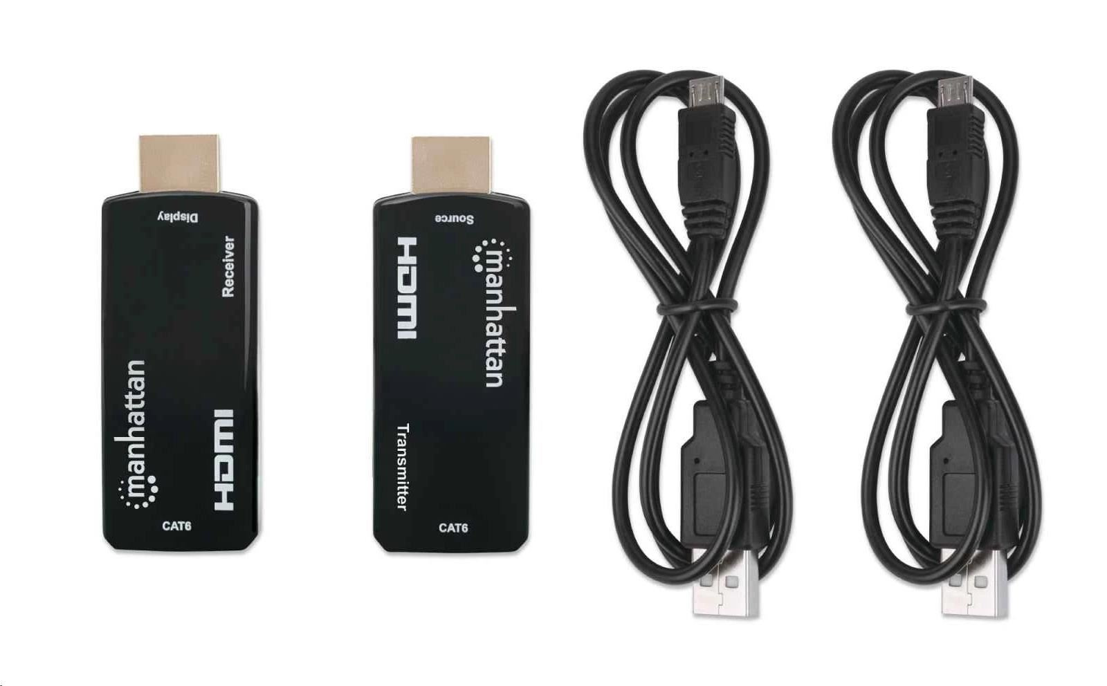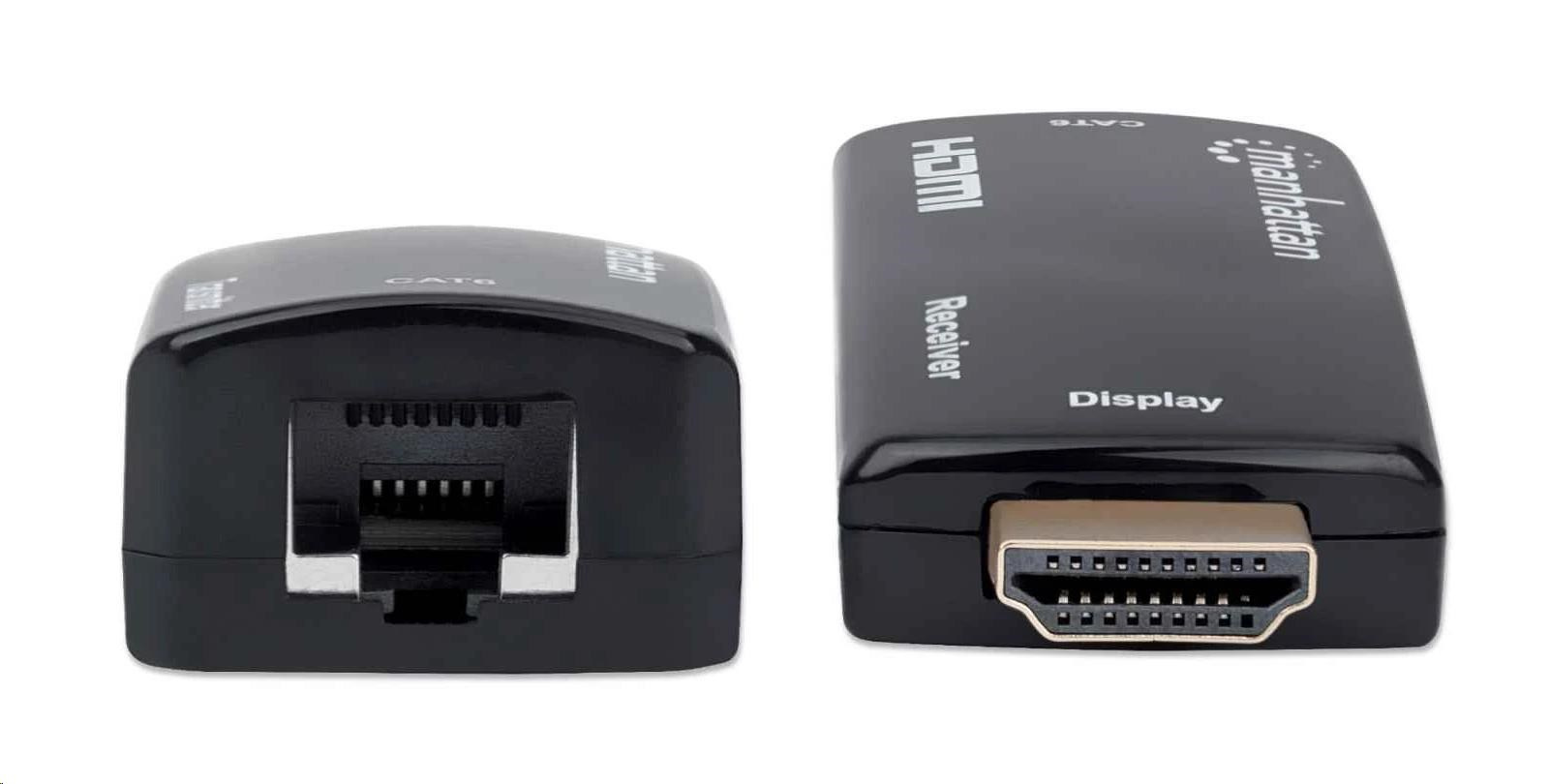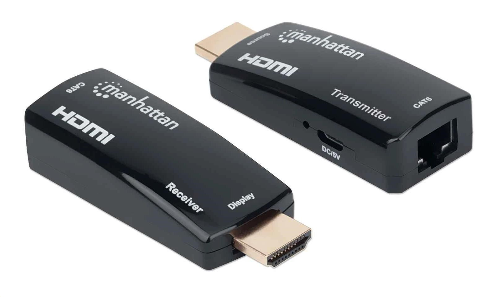 The Manhattan 1080p Compact HDMI over Ethernet Extender Kit can connect nearly any digital HDMI source (e.g., gaming console [PlayStation®, Xbox® and more], Blu-ray player, satellite receiver, digital recorder, etc.) to an HD display or projector at a distance up to 60 m (196 ft.) with one Cat6 Ethernet cable. The Kit provides reliable 1080p@60Hz resolution video and multichannel audio transmission over longer distances than HDMI cables alone. Its slim and compact design is ideal for installations in confined spaces or virtually anywhere.
