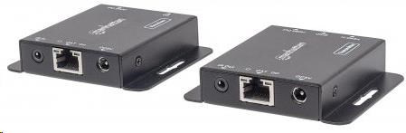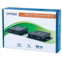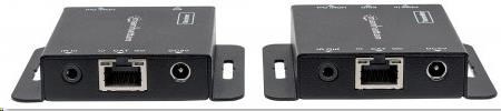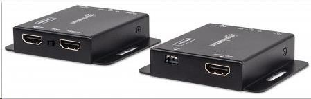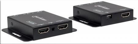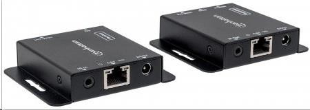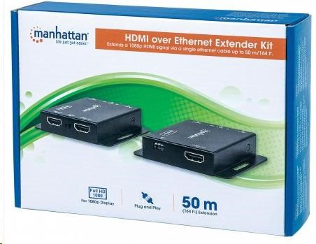 The Manhattan 1080p HDMI over Ethernet Extender Kit is the ideal solution for connecting virtually any HDMI source (PlayStation, Xbox, Blu-ray player, satellite receiver, digital recorder, etc.) to an HD display or projector up to 50 m (164 ft.) from its source via a single Cat6 Ethernet cable. These powered HDMI Extenders provide reliable 1080p resolution video and multichannel audio transmission over longer distances than is possible with HDMI cables alone. Plus, the transmitter module has an additional HDMI output port, allowing a second monitor to be placed in a control closet or run to second display. For additional quality control, the Manhattan 1080p HDMI over Ethernet Extender Kit includes an EDID control switch to minimize display issues, a built-in equalizer dip switch for long-run screen flickering corrections and a wideband IR blaster and receiver for remote control of the source device.