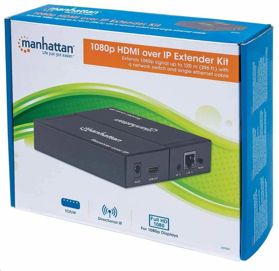 | Package Contents | 1080p HDMI over IP Extender Splitter Kit (receiver & transmitter modules) Power adapter (two units) IR blaster and receiver (one unit) Wall mounting hardware (two units each) Quick Instruction Guide |