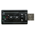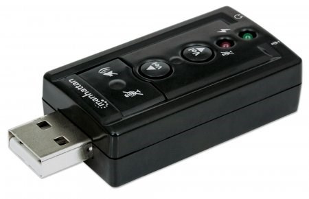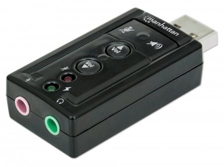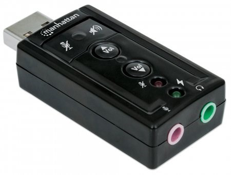 Ideal for desktop, notebook and netbook computers, the Manhattan Hi-Speed USB 3D 7.1 Sound Adapter instantly creates microphone-in and audio-out ports through any USB port. Easily connect headsets, microphones and speakers equipped with 3.5 mm cables that are too short to reach ports in awkward or inconvenient locations comfortably. With plug-and-play and hot-swap capabilities, it easily replaces inoperative sound cards, bypasses damaged audio ports and improves access without special drivers or software. A built-in Class-B power amplifier utilizes USB bus power, eliminating the need for external energy supplies or additional cables. Support for 3D audio and virtual 7.1 surround sound and built-in sound effects with a 10-band equalizer deliver rich, high-quality experiences with familiar USB convenience and functionality.