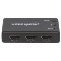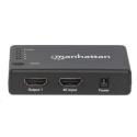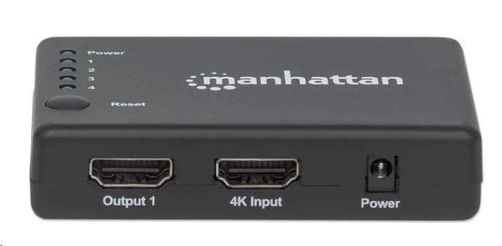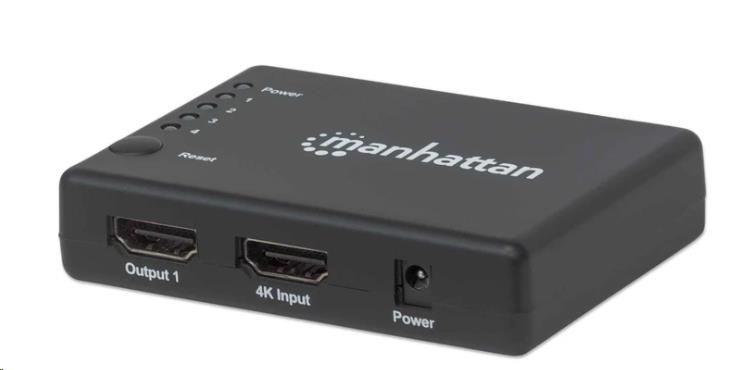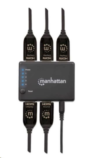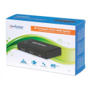 The Manhattan 4K 4-Port HDMI Splitter with built-in booster streams a 4K HDMI signal from a single UHD source to up to four UHD displays.