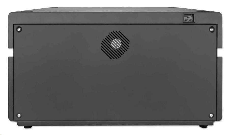 Keep your devices organized in the 20 bays with 264 (D) x 22 (W) x 235 (H) mm / 10.39 x 0.87 x 9.25 in. each. Use the cable management built into the dividers to structure your charging cables (available from Manhattan). As this Desktop Charging Cabinet features USB-C ports instead of AC outlets, you do not need additional wall chargers. The AC input on the back is a C20 connector that lets you replace the included power cable with other cables based on your region.