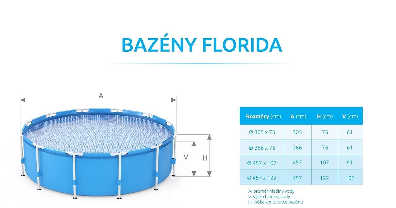 Akční nabídky na váš e-mailBazén Marimex Florida se řadí mezi velmi oblíbené nadzemní bazény v České republice. Koupání ve vlastním velkém bazénu si může dopřát opravdu každý. Hlavním benefitem bazénu Florida je výhodná cena, snadná údržba, stabilita konstrukce, široká hladina vody i snadné zprovoznění. Stačí jen připravit místo na bazén, rozvinout bazénovou podložku, bazén rozbalit, sestavit podpěrnou konstrukci, na kterou se navlékne bazénová folie. Od vybalení bazénu můžete do 30 minut napouštět vodu.