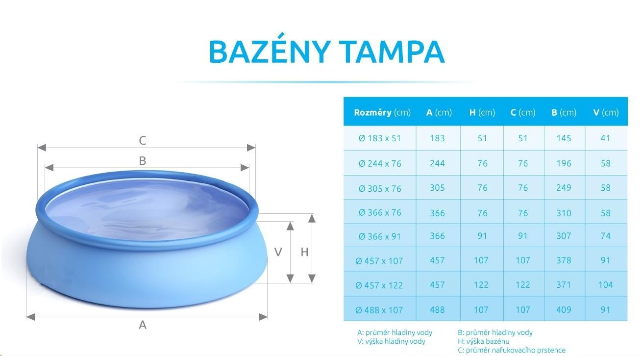 Akční nabídky na váš e-mailBazén Tampa se řadí mezi neprodávanější a nejoblíbenější bazény v České republice. Koupání ve vlastním bazénu si může dopřát opravdu každý. Předností bazénu Tampa je nízká cena, snadná údržba i rychlé zprovoznění. Stačí jen připravit místo na bazén, rozvinout bazénovou podložku, bazén rozbalit, nafouknout horní límec a začít napouštět vodu. Stoupající voda sama bazén postaví. Od vybalení bazénu můžete do 10 minut napouštět vodu. Bazén je nutné po skončení bazénové sezony vyčistit, vypustit a uklidit na suché, nemrznoucí místo. Správnou údržbou prodloužíte životnost bazénu. Doporučujeme bazén po koupání zakrývat krycí plachtou. Pro snadné nafouknutí doporučujeme zakoupit ruční či elektrickou pumpu.
