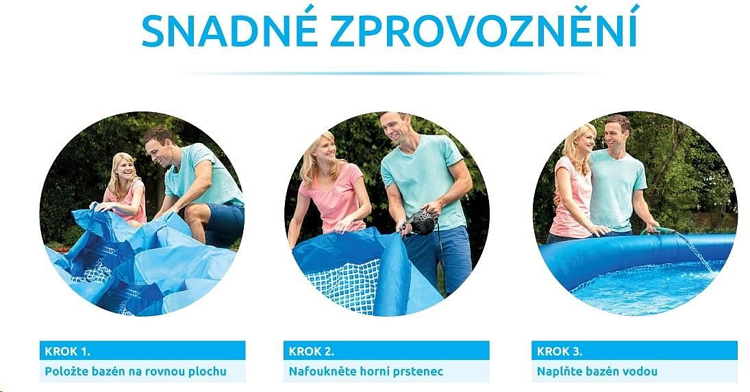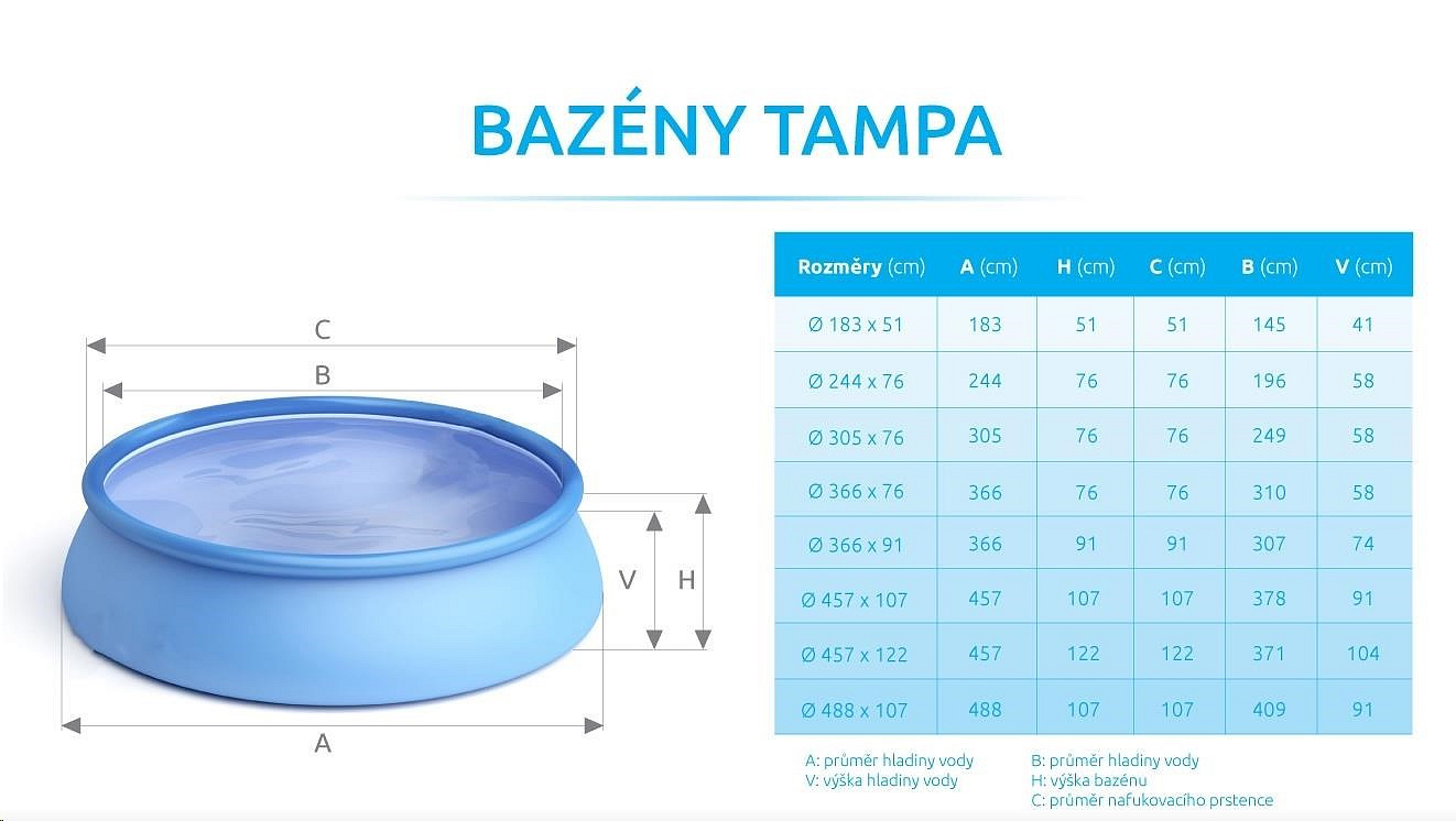 Akční nabídky na váš e-mailBazén Tampa se řadí mezi nejprodávanější a nejoblíbenější bazény v České republice. Koupání ve vlastním bazénu si může dopřát opravdu každý. Předností bazénu Tampa je nízká cena, snadná údržba i rychlé zprovoznění. Stačí jen připravit místo na bazén, rozvinout bazénovou podložku, bazén rozbalit, nafouknout horní límec a začít napouštět vodu. Stoupající voda sama bazén postaví. Od vybalení bazénu můžete do 10 minut napouštět vodu. Bazén je nutné po skončení bazénové sezony vyčistit, vypustit a uklidit na suché, nemrznoucí místo. Správnou údržbou prodloužíte životnost bazénu. Doporučujeme bazén po koupání zakrývat krycí plachtou. Pro snadné nafouknutí doporučujeme zakoupit ruční či elektrickou pumpu.