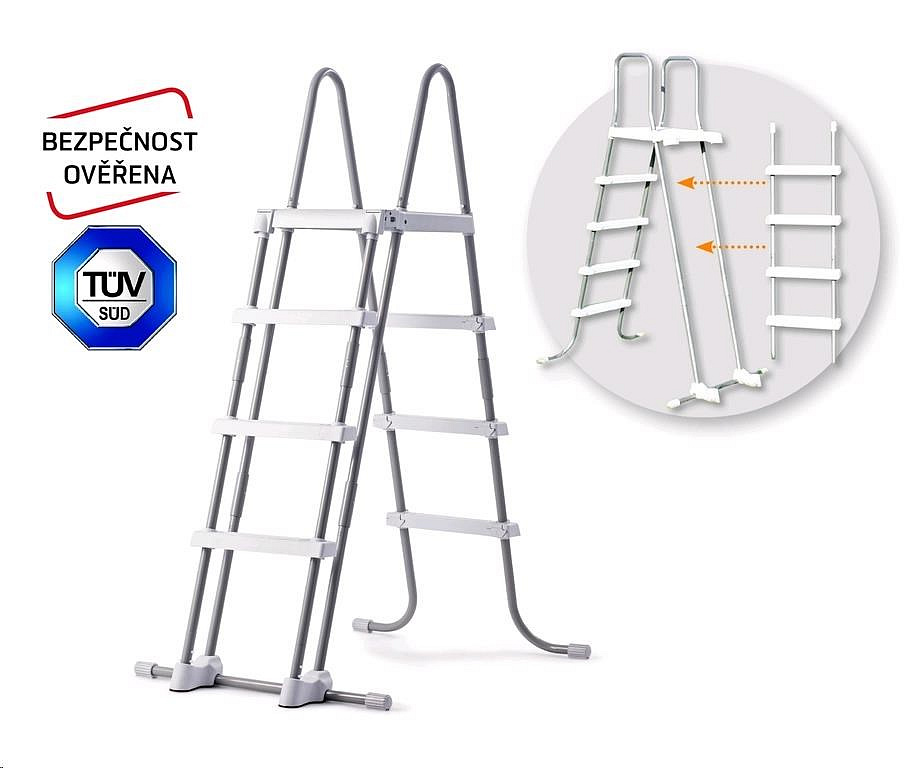 Bezpečnostní schůdky pro bazény do výšky 1,25 m. Šířka schodu je 33 cm. Schůdky mají plastovou horní základnu. Schůdky mají odnímatelná stupátka - při jejich odnětí zamezíte nekontrolovatelnému vstupu dětí do bazénu. Maximální nosnost 136 kg..