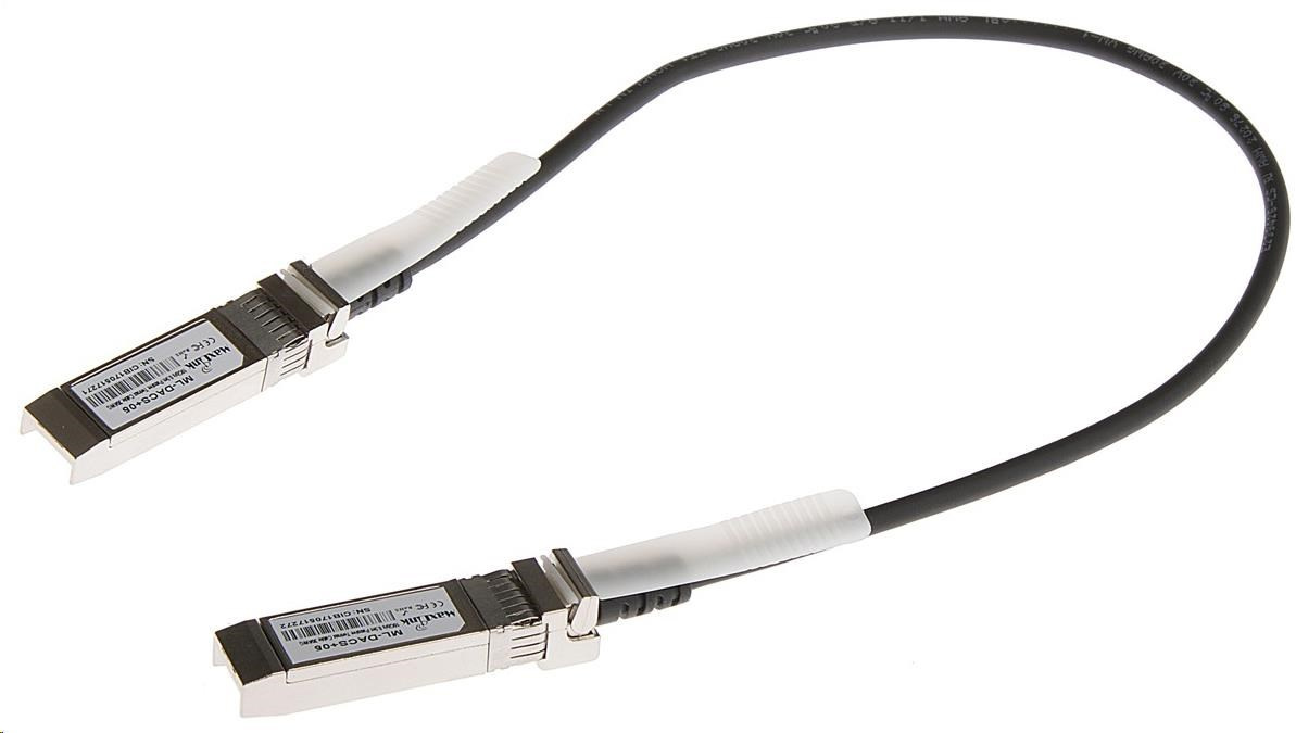 MaxLink 10G SFP+ DAC kabel, pasivní je rychlé a levné řešení pro snadné propojení dvou síťových aktivních prvků switch/router rychlostí 1G nebo 10Gbps bez nutnosti pořízení SFP/SFP+ modulů či jiného příslušenství (například optické patch kabely).Kvalitní twinax DAC kabel je dodáván s universální Cisco kompatibilitou, která zaručí bezproblémové použití s většinou výrobců aktivních prvků. DAC propojovací kabel se zapojí přímo do SFP/SFP+ slotu na aktivním prvku a ihned tak vytvoření spojení rychlostí až 10Gbps. Propoj pomocí DAC se v aktivním prvku jeví i chová jako spojení klasickými SFP/SFP+ moduly. Délka 0,5m, pasivní provedení..