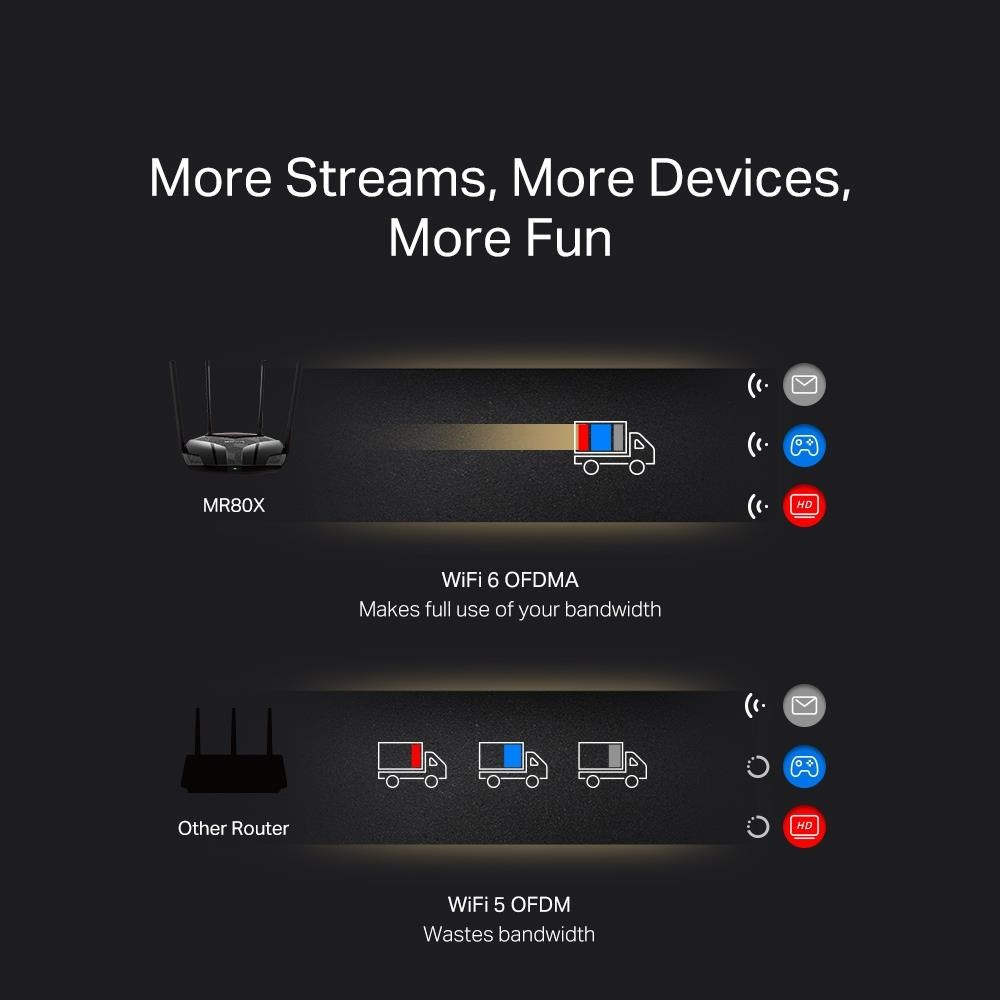 | Package Contents | • AX3000 Wi-Fi 6 Router MR80X • Power Adapter • Quick Installation Guide • RJ45 Ethernet Cable |