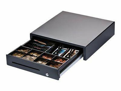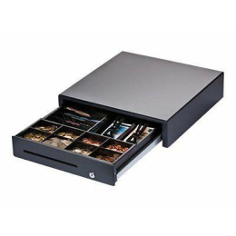 cash drawer, front opening, dimensions (WxHxD): 410x114x415mm, insert: 6 note compartments, 8 coin compartments, 1 receipt compartment, direct printer connection, RJ12, colour: dark grey.