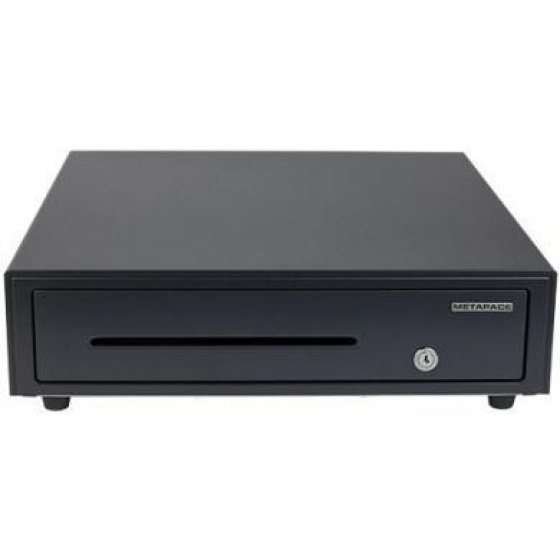 cash drawer, front opening, dimensions (WxHxD): 410x114x415mm, insert: 6 note compartments, 8 coin compartments, 1 receipt compartment, direct printer connection, RJ12, colour: black.
