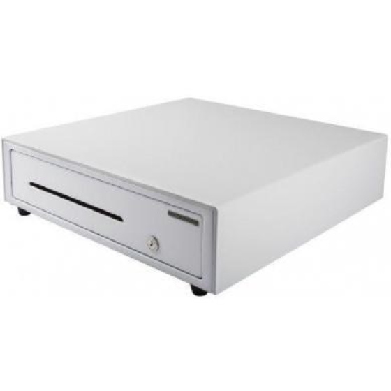 cash drawer, front opening, dimensions (WxHxD): 410x114x415mm, insert: 6 note compartments, 8 coin compartments, 1 receipt compartment, direct printer connection, RJ12, colour: white.