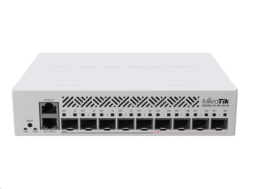 Akční nabídky na váš e-mailOptický Cloud Router Switch CRS310-1G-5S-4S+IN je vhodným řešením pro stolní nebo 19" rack a zároveň menší centrální optický switch, který nabízí5× SFPrychlost 1G,4× SFP+s rychlostmi 1G/10G,1× Gigabit Ethernet ports podporou pasivního PoE napájení a konzolovým RJ45 portem, výpočetní výkon zajišťuje moderní ARM CPU v7, 256 MB RAM, které doplňuje aktivní chlazení na zadní straně. Switch lze napájet jak přes DC konektor, tak přes ethernetový port podporující pasivní PoE s napětím 18 - 57 VDC.
