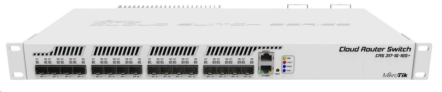 CRS317-1G-16S+RM je zcela nový Cloud Router Switch s L3 funkcemi s montáží do 19" racku. Switch je vybaven 16x SFP+ porty s rychlostí 10Gbps se zpětnou kompatibilitou i pro 1Gbps moduly, dále gigabitovým ethernetovým portem pro management a jedním sériovým portem.