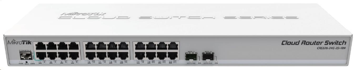 Popis produktu CRS326-24G-2S+RM je nové zařízení v MikroTik portfóliu s tzv. "Dual boot", které umožňuje spuštění s klasickým RouterOS nebo SwOS. Zařízení má přídavný procesor umožňující chod RouterOS, který většina lidí u MikroTik zařízení požaduje. Přídavný procesor nabízí velmi limitovaný výkon, který zvládne spuštěný nejnutnějších RouterOS funkcí, které jsou velkou výhodou oproti konvenčním switchům s webovým rozhraním. Co se konektorové výbavy týče, switch disponuje 24 GLAN porty (10/100/1000) s podporou pasivního PoE na prvním portu, dvojicí SFP/SFP+ portů podporující jak 1.25Gbps tak 10G moduly, RJ45 sériový port a napájecím konektorem na zadní straně s variabilním napájením 9 až 30V DC. Obsah balení Zařízení Napájecí adaptér 24V/1.2A Úchyty do racku Technické parametry Konektory a rozhraní Rychlost LAN:(24) 10/100/1000Mbps Gigabit LAN:Ano Optické rozhraní:(2) 1G/10Gbps Sériový port:RJ45 Napájení Napájení přes PoE:10 .. 30V DC Typ napájení:DC konektor, PoE Typy PoE:PoE-In (pouze) Max. spotřeba energie [W]:24 Napájení přes konektor/svorkovnici:10 .. 30V DC Fyzické charakteristiky Provedení:Rackmount Počet "U" pozic:1 Ventilátory:Bez ventilátoru Šasi:Kovové Tlačítka:Reset Provozní teplota [°C]:-40 až 60 Šířka [mm]:440 Výška [mm]:44 Hloubka [mm]:144 Hardware CPU:98DX3236A1 Frekvence CPU [MHz]:800 Počet CPU jader:1 Interní uložiště [MB]:16 RAM [MB]:512 Software Web management:Ano Management:Webové rozhraní Funkce:VLAN, QoS, DHCP snooping, L3 Operační systém:SwOS, RouterOS - L5 Výchozí IP adresa:192.168.88.1 Výchozí jméno a heslo:admin / -.