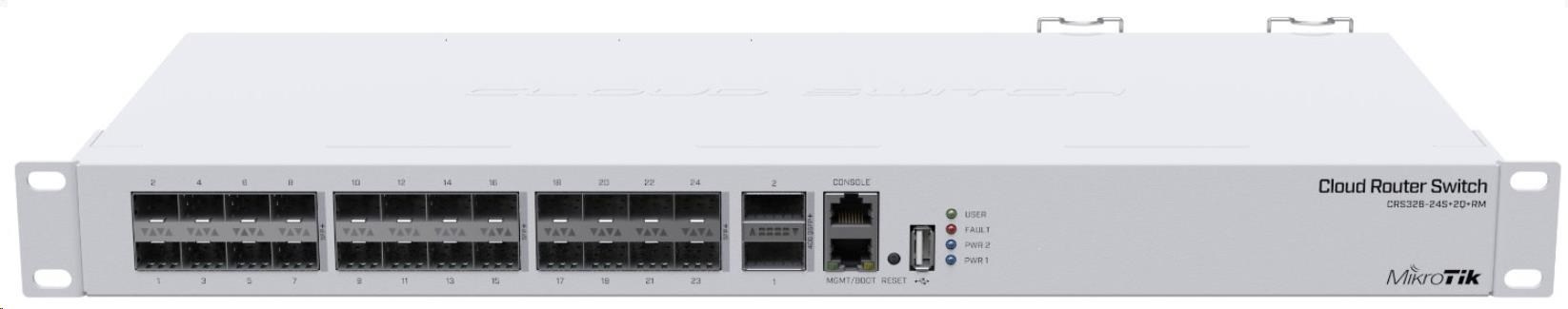 CRS326-24S+2Q+RM se snadno spravuje - má USB port plné velikosti pro konfiguraci a duální napájení pro redundanci.