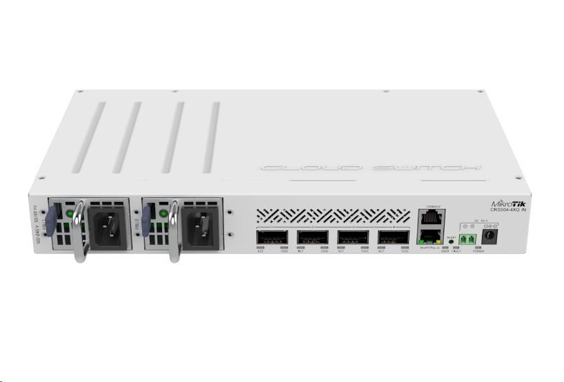 Akční nabídky na váš e-mailOptický Cloud Router Switch CRS504-4XQ-IN je vhodné řešení pro montáž do 19" racku pro přístup k sítím 100 Gb/s a jako malý centrální optický přepínač, který nabízí4x QSFP28s rychlostí 100 Gbps,1x Ethernet ports podporou pasivního napájení PoE a konzolovým portem RJ45. Switch lze napájet přes dva redundantní hot-swap zdroje, DC konektor/DC svorkovnici (36 - 57V DC), stejně jako přes ethernetový port podporující pasivní PoE s napětím 43 - 57V DC. Maximální příkon zařízení je 41 W.