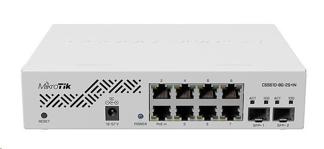 MikroTik Cloud Smart Switch CSS610-8G-2S+IN je nastavitelný, 8-portový Gigabitový switch s dvěmi SFP+ sloty, bez ventilátoru a kitem pro přichycení do 19" racku. Součástí je také speciálně navržený operační systém pro rychlé přepínání a velikou škálu nastavení - SwOS.