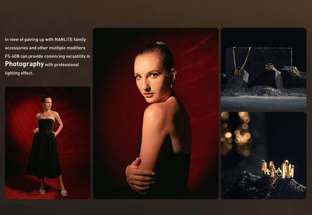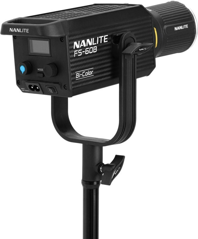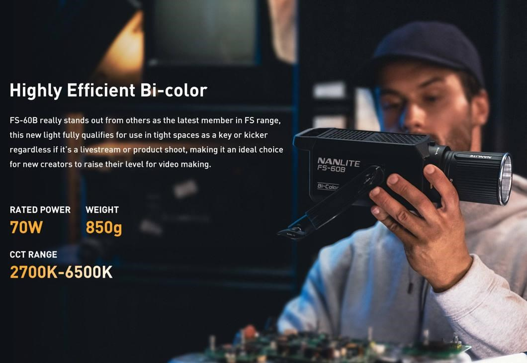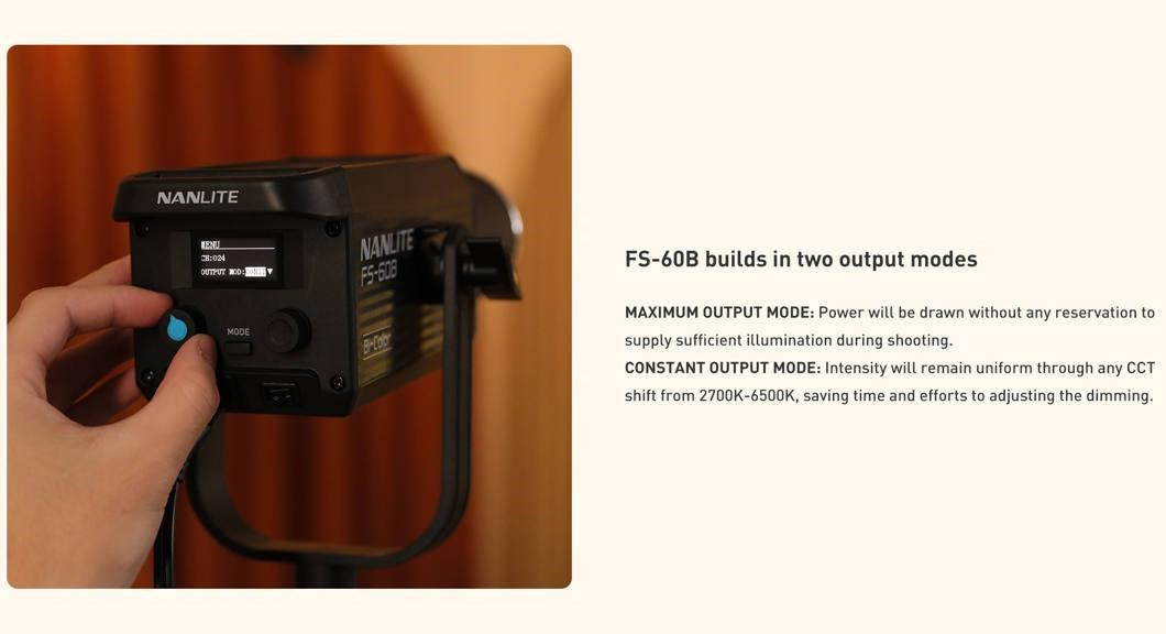 Model FS-60B má 12 vestavěných přizpůsobitelných efektů a dodává se spolu s adaptérovým bajonetem Bowens pro samostatně dostupné modifikátory světla.