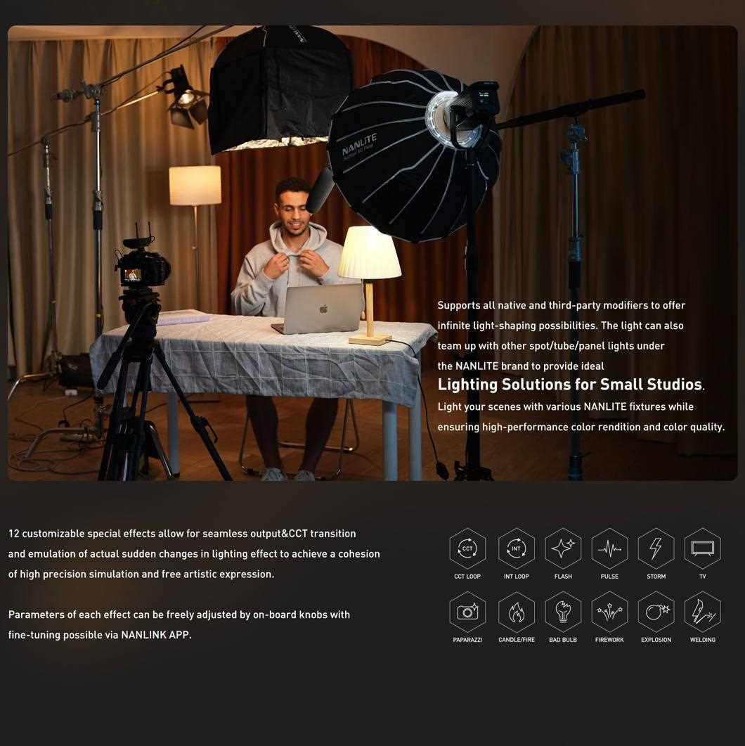 Díky předprogramovaným přizpůsobitelným speciálním efektům se se světlem FS-60B snadno simulují specifické a kreativní scénáře osvětlení. Světlo imituje 12 různých světelných efektů včetně CCT loop, INT loop, blesku, pulzů, bouře, televize, paparazzi, svíčky/ohně, vadné žárovky, ohňostroje, výbuchu a záblesků při svařování.